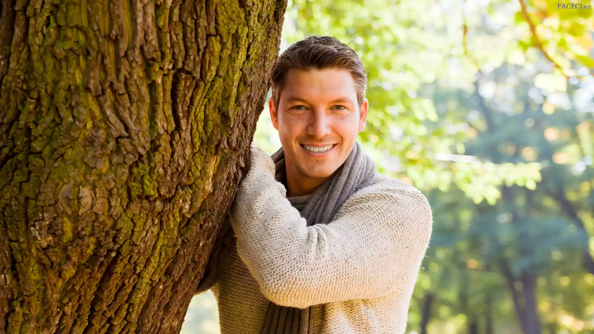 Uśmiech, Drzewo, Mężczyzna, Szalik - faceci.biz